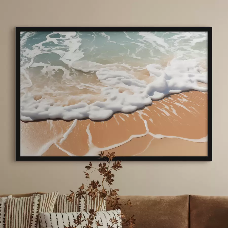 Jūros bangos putos jungiasi su smėlio krantu, mėlynos, baltos ir oranžinės, smėlio spalvos