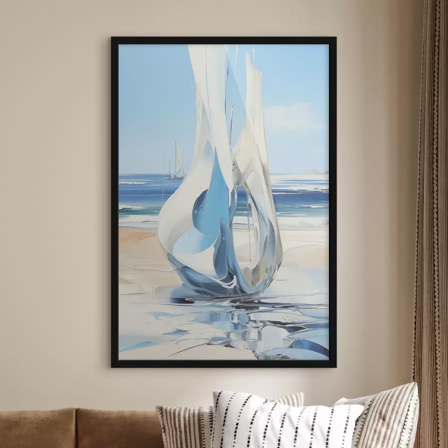 Abstrakti skysta figūra krante prie jūros aliejiniais paveikslais