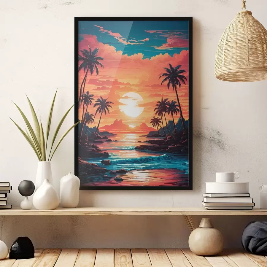 Peizažas su burlaiviu ramioje jūroje, oranžiniu ir geltonu dangumi, tolimais kalnais