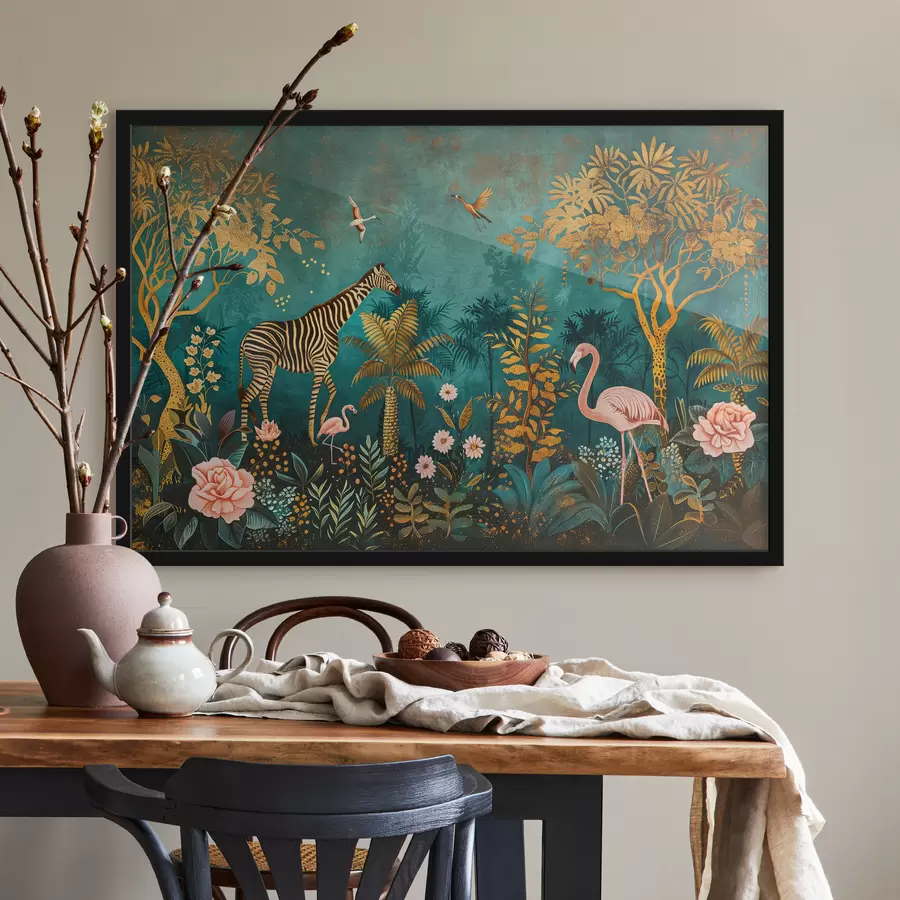Užburtas safaris: vintažinė iliustracija su zebrais, flamingais, paukščiais švelniai samanų žalia, mėlyna, rožinė