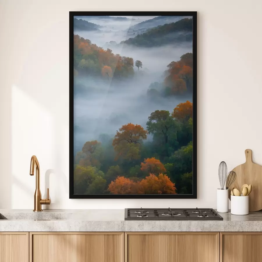 Ramus kraštovaizdis su miglotu mišku, plikais medžiais ir ramiu ežeru, kuriame atsispindi švelnūs rausvi ir balti tonai