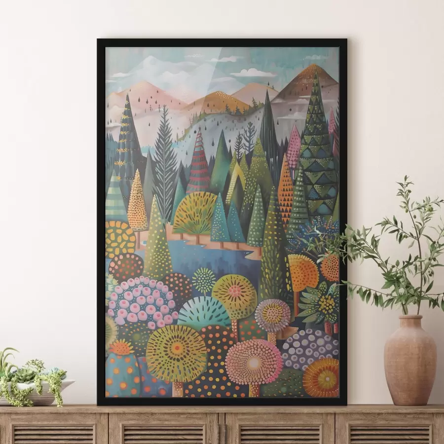 Gražus akvarelinis miškas su pušimis ir švelnia saulės šviesa