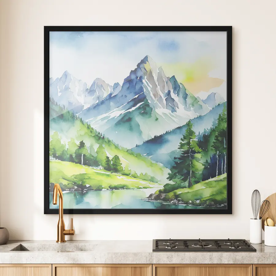 Kalnai su miško kraštovaizdžiu, žalios spalvos, akvarelės stilius