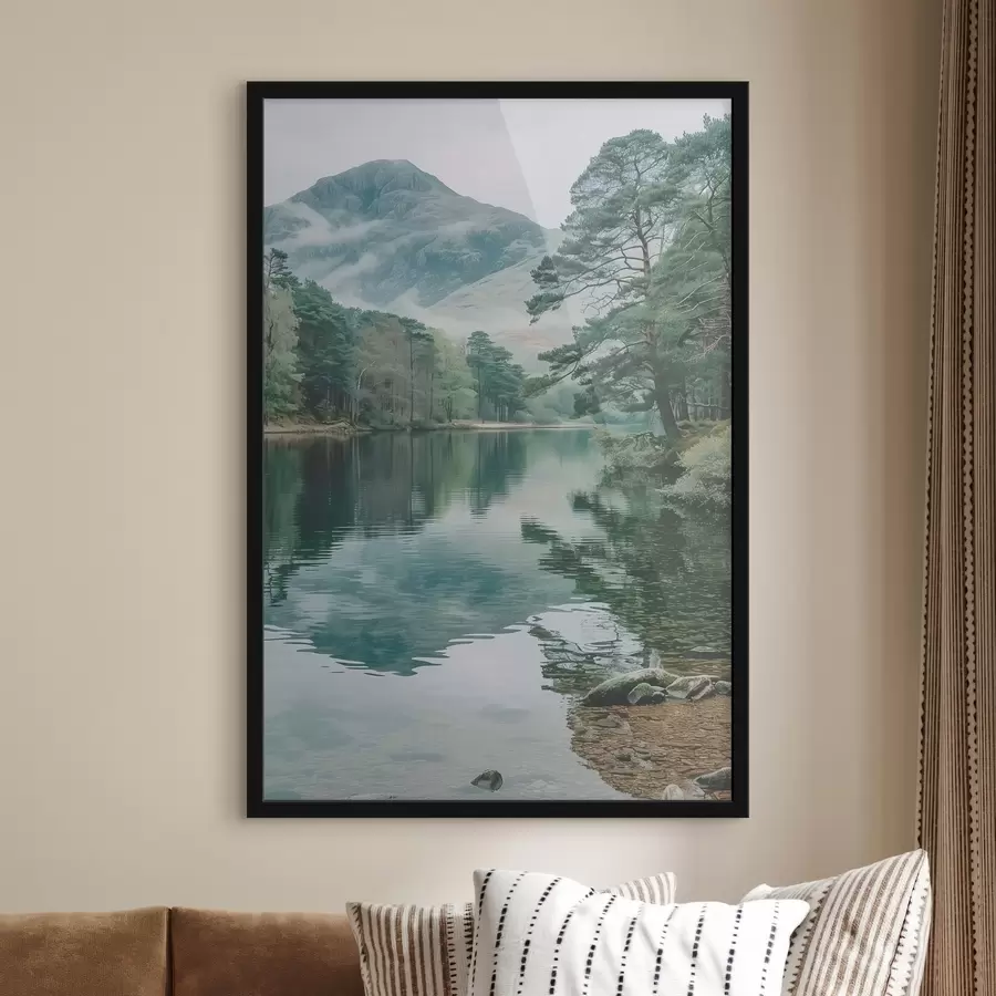 Miglotas ežero kraštovaizdis su pušimis ir kalnais, debesuotas pilkas dangus