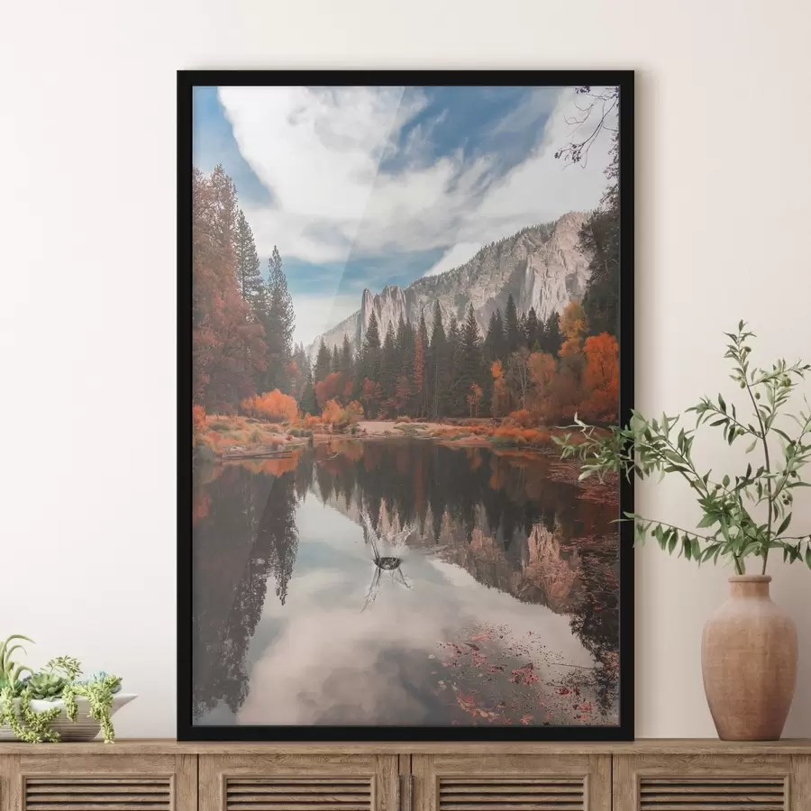 Rudens peizažas su kalnais, atsispindinčiais ramioje ežero vandenyje
