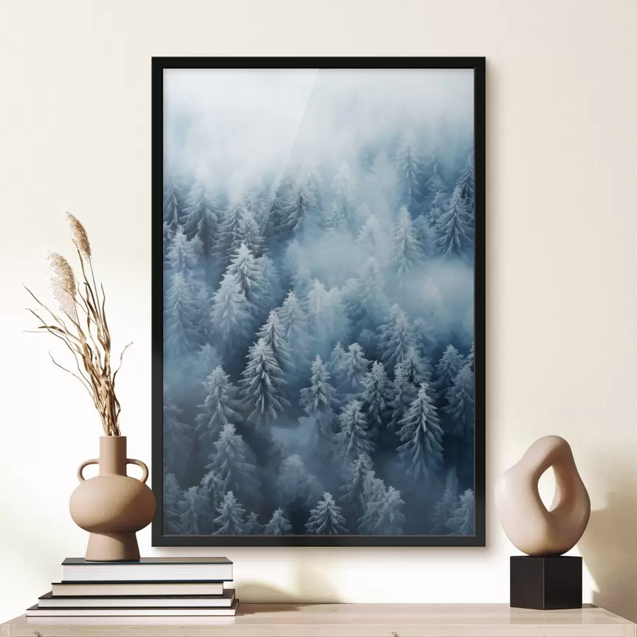 Mistinis miškas pilkuose tonuose, gamtos peizažas, medžiai