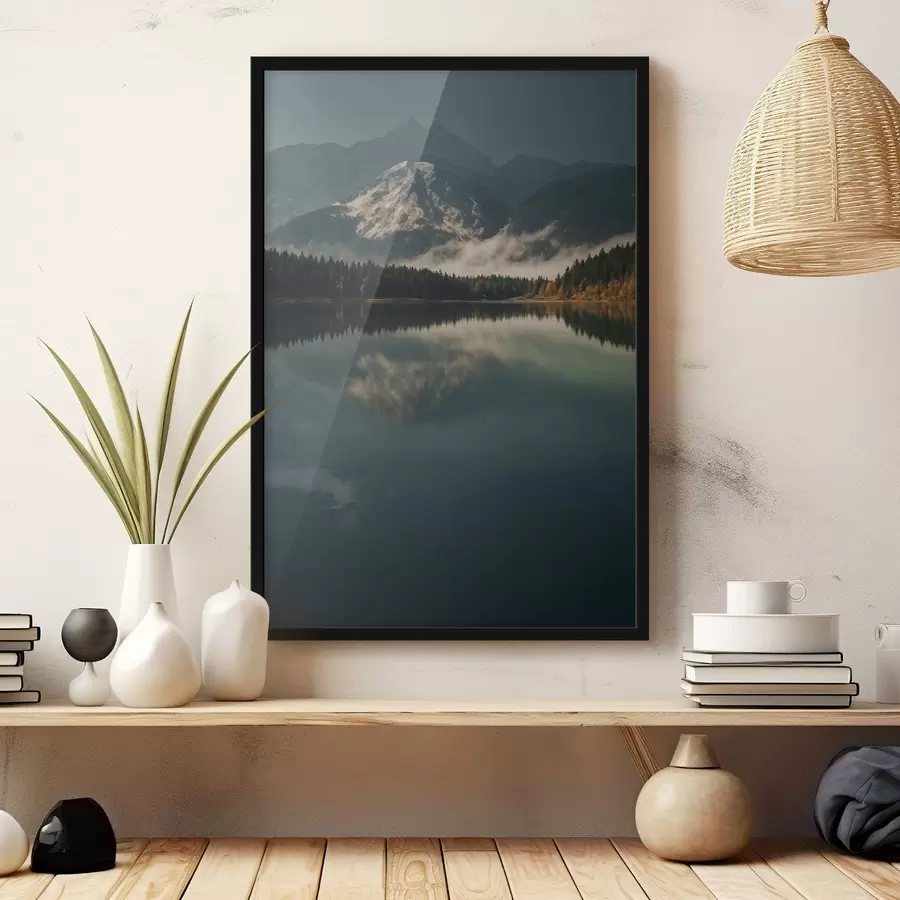 Peizažas su minkštais kalnais, ramiu ežeru, kuriame atsispindi peizažas, ir medžiais su oranžine lapija