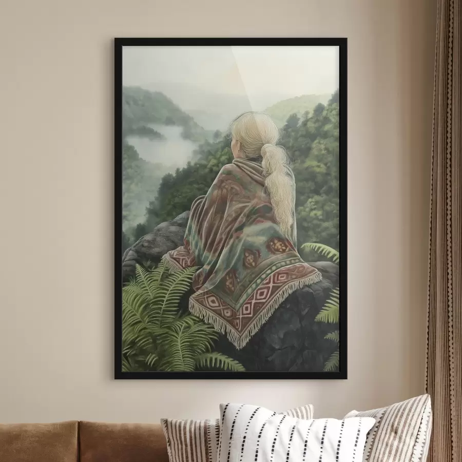 Mergina antklode sėdi ant uolos, kalnai, miško rūkas, gamtos peizažas