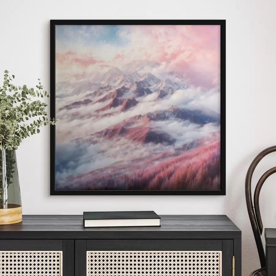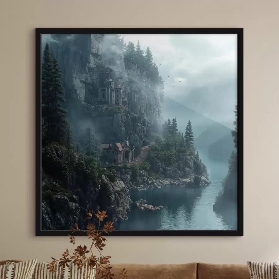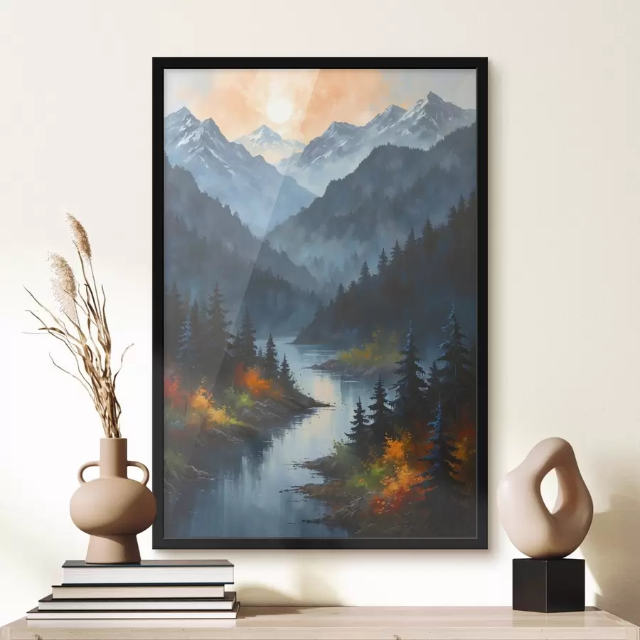 Gražūs rūke paskendę kalnai, rudens miškas, akvarelė