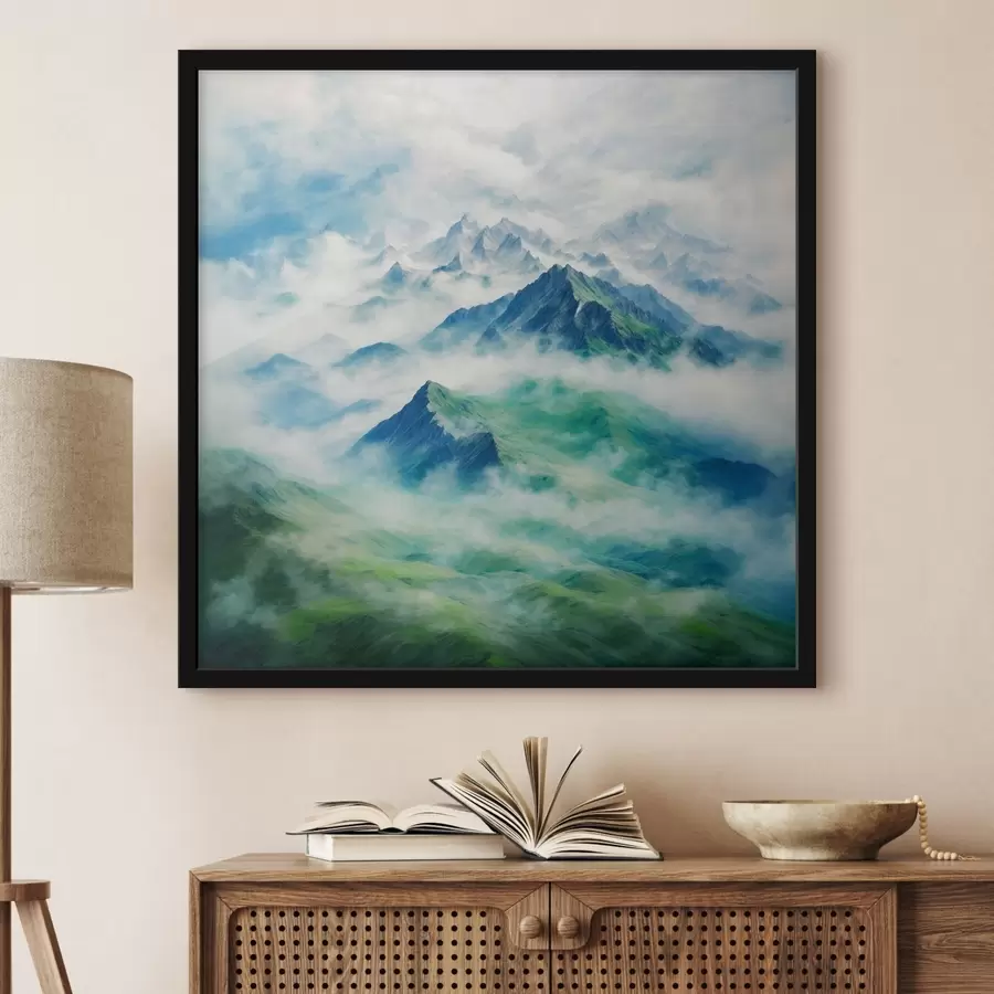 Gražūs kalnai, miglotas miško kraštovaizdis, akvarelė, kaimas