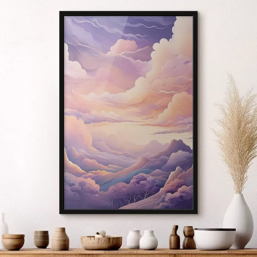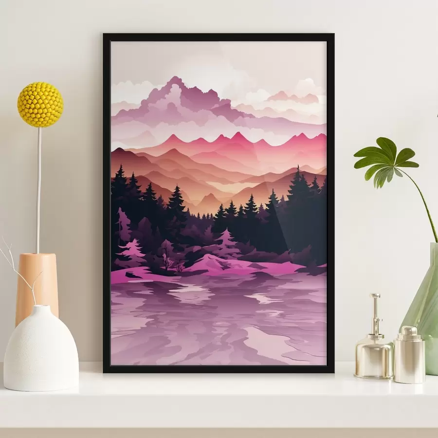 Akvarelės imitacija, miškas ir kalnai, oranžiniai atspalviai