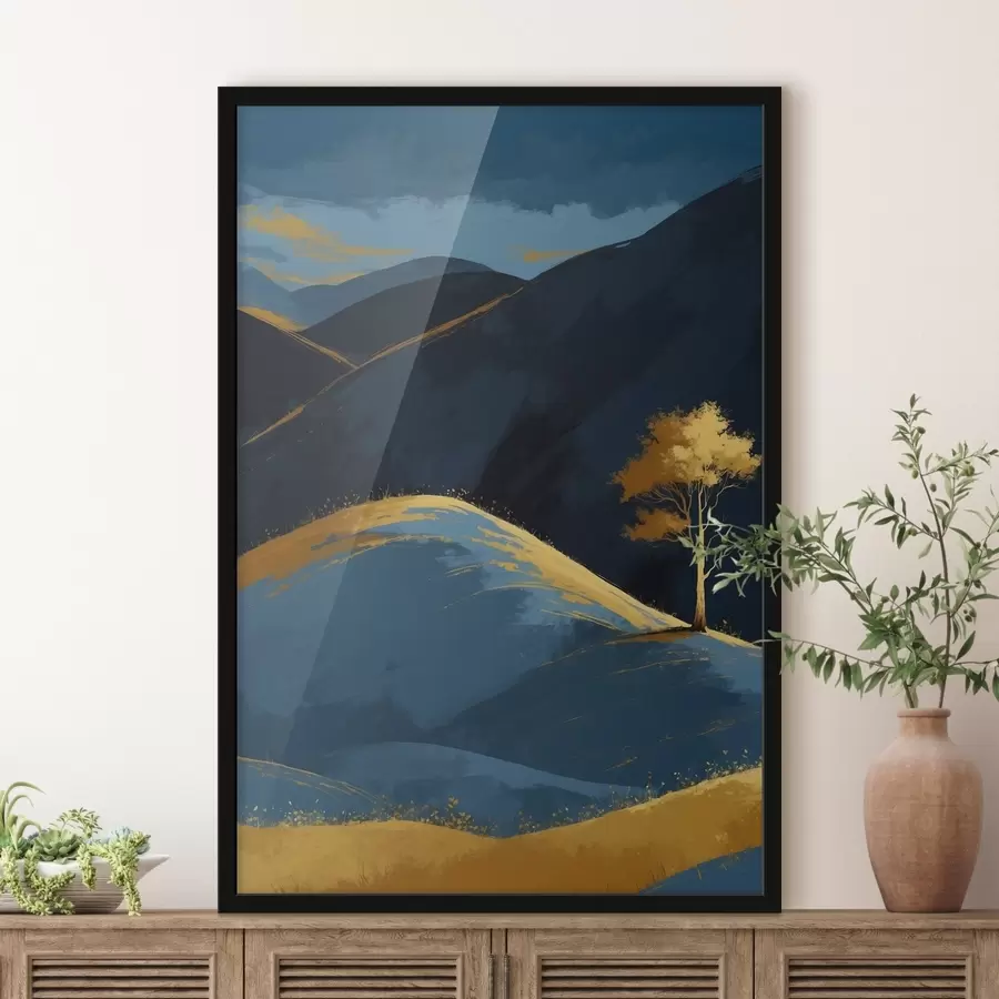 Besileidžiančios saulės šešėliai virš ramių kalvų