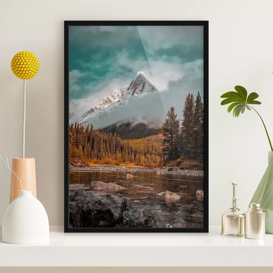 Rudeninis kalnų kraštovaizdis su sraunia upe, auksiniais medžiais ir didinga viršūne šviesaus dangaus fone.