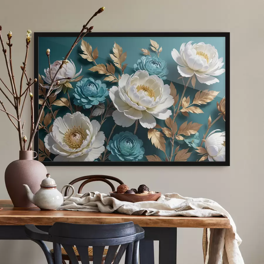 Didelių baltų ir melsvai žalių bijūnų gėlių puokštė geltonais lapais žalsvai melsvos spalvos fone
