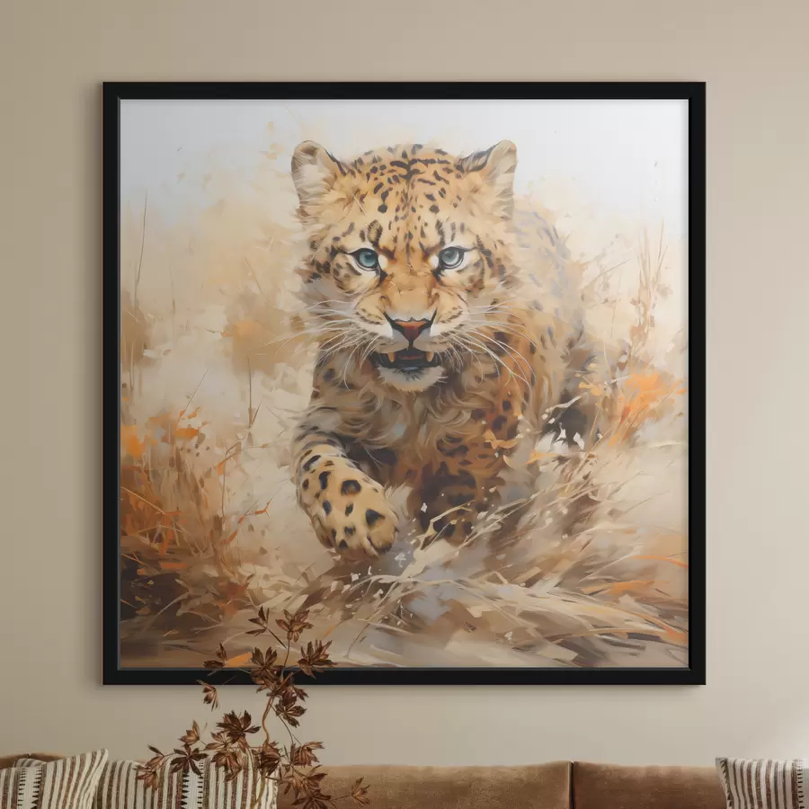 Gepardas mėlynomis akimis ir iltimis sėdi ant sausos žolės aliejumi tapybos abstrakčiojo meno