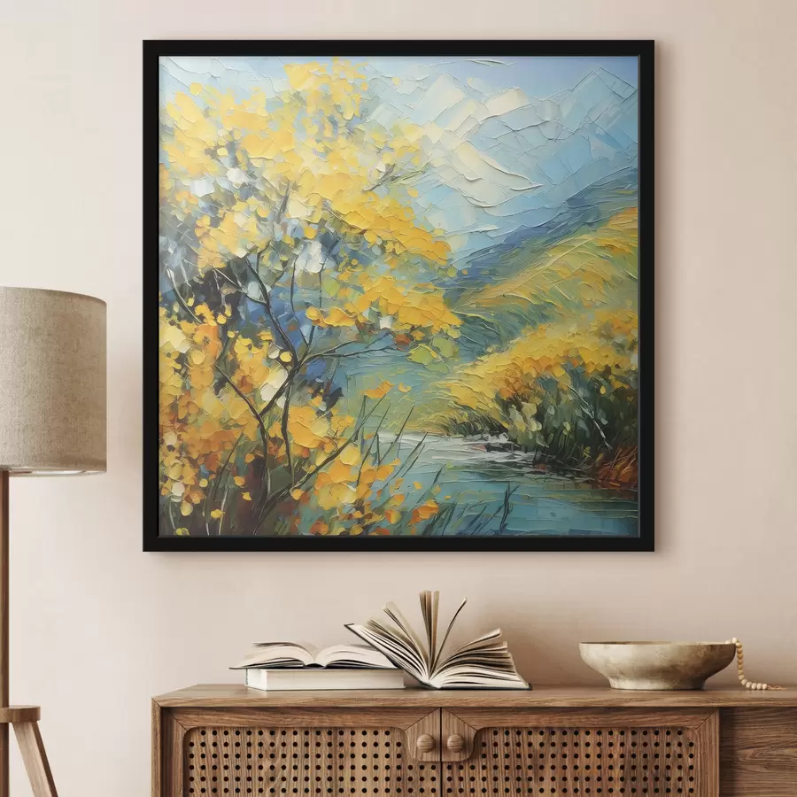 Medis geltonais žiedais, gamtos peizažas, aliejinė tapyba, ryškūs teptuko potėpiai, vasara