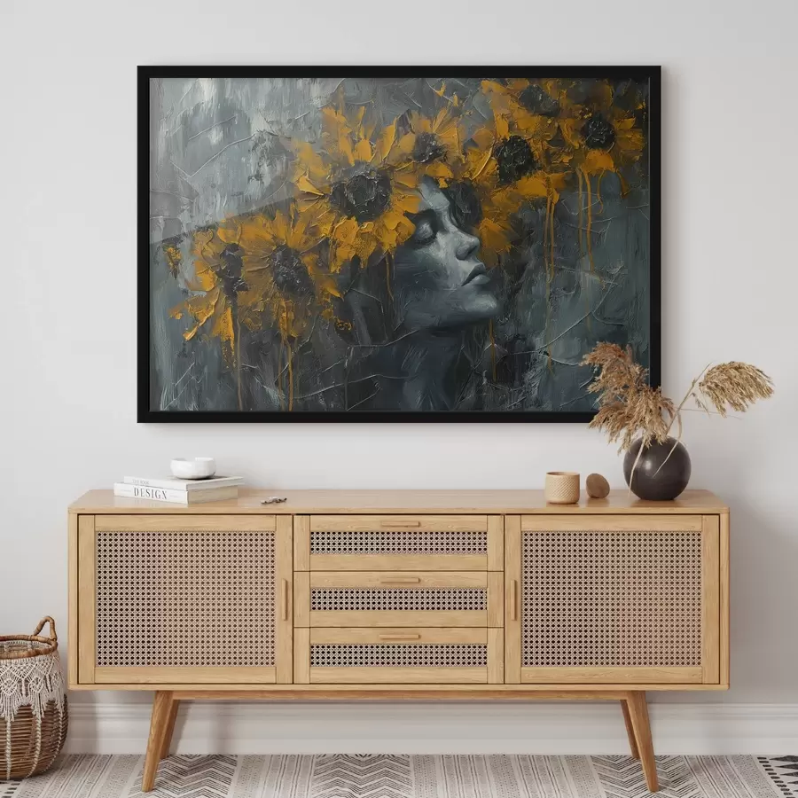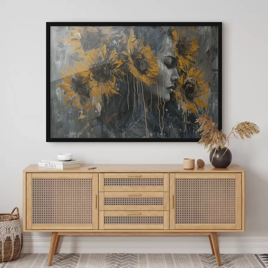 Abstrakčios saulėgrąžos, dengiančios mergaitės veidą
