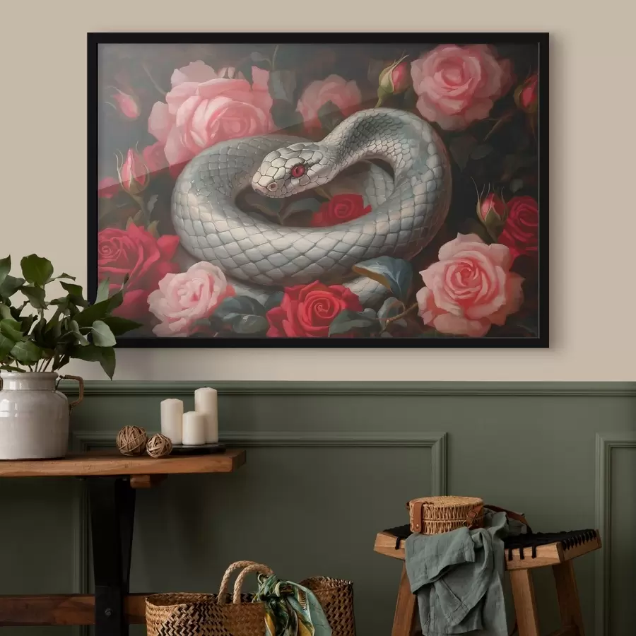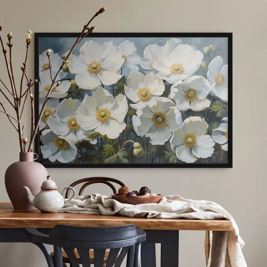 Vaza su baltų gėlių šakelėmis ir citrinos imitacijos paveikslu