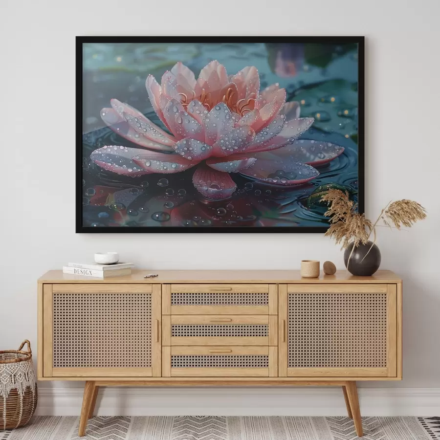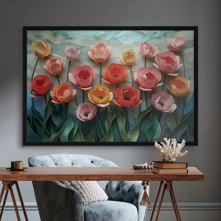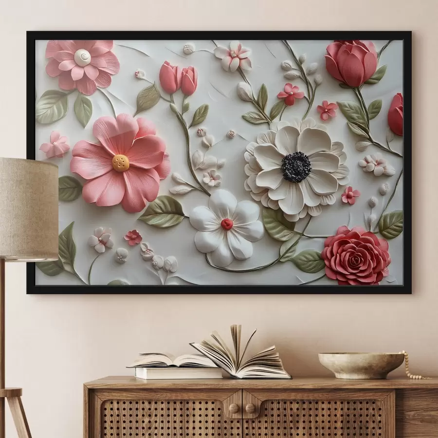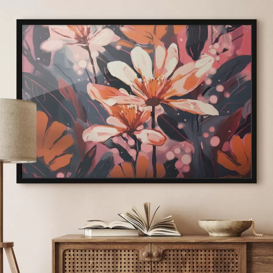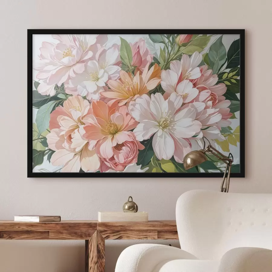 Didelių rausvų bijūnų su minkštais žiedlapiais ir geltonais centrais, apsuptų žalių lapų, imitacija aliejiniais dažais