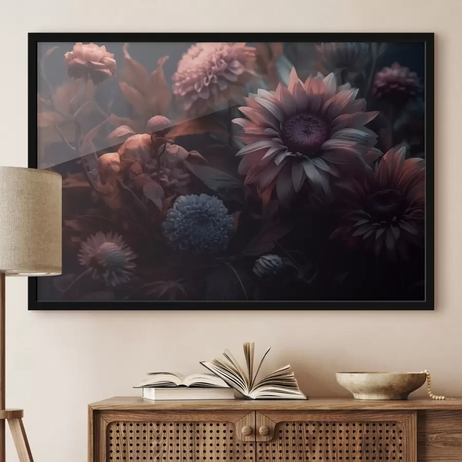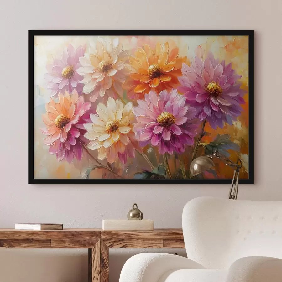 Spalvingos gėlės, įskaitant raudonus, rožinius ir violetinius jurginus, margučius ir kitus žiedus minkštame, neryškiame fone