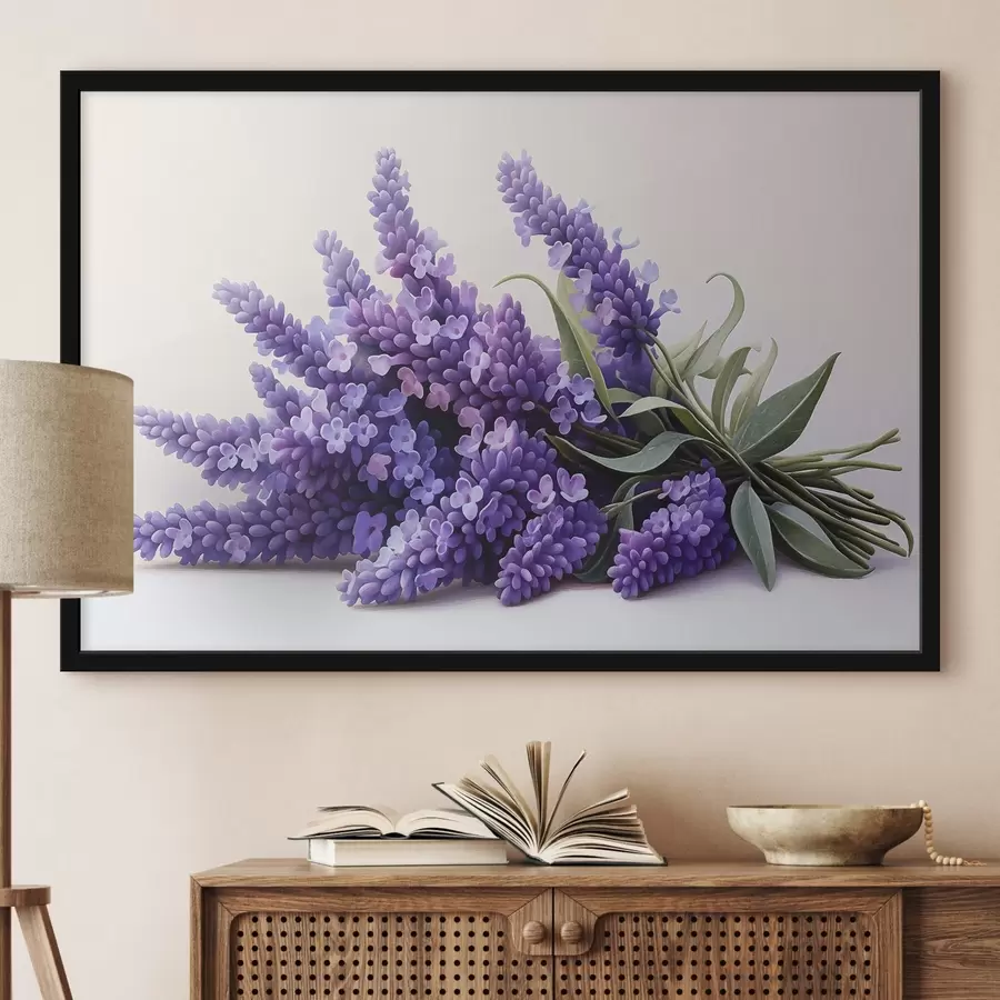 Ryškių mėlynų ir violetinių gėlių puokštė su švelniais žiedlapiais ir žaliais lapais šviesiame fone
