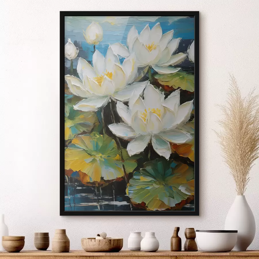 balti lotoso žiedai ant vandens, didelės gėlės, aliejiniai dažai