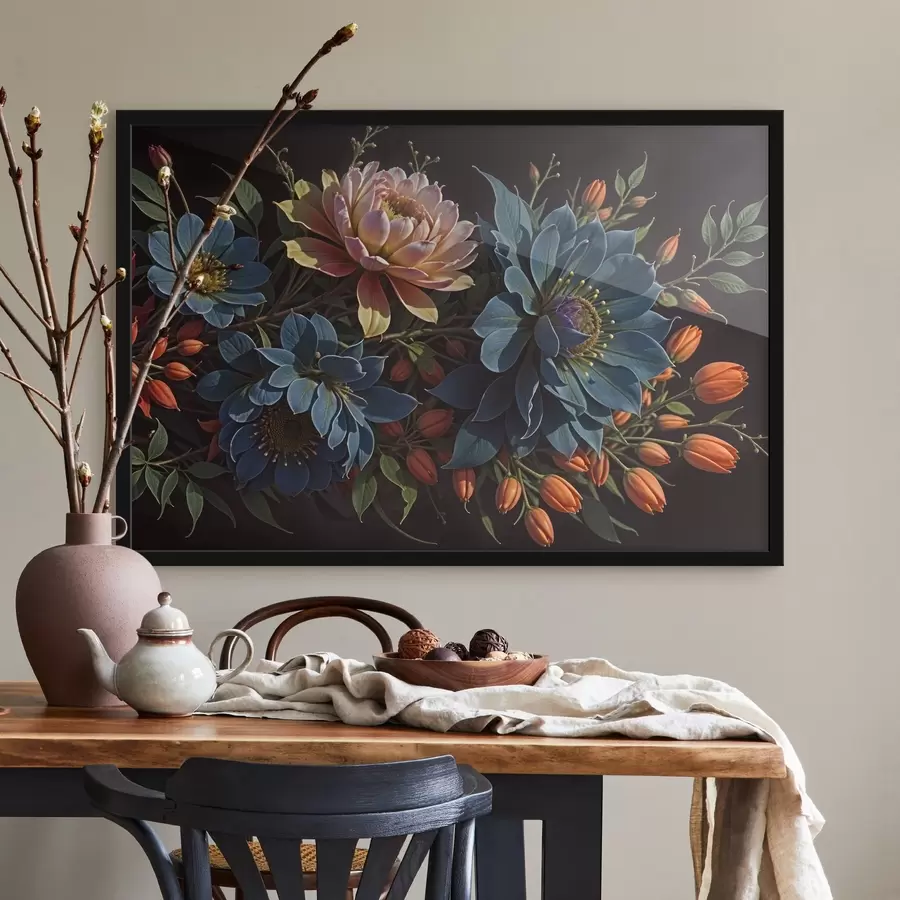 Ryški didelių, spalvingų rausvų, oranžinių ir mėlynų jurginų gėlių puokštė tamsiame fone