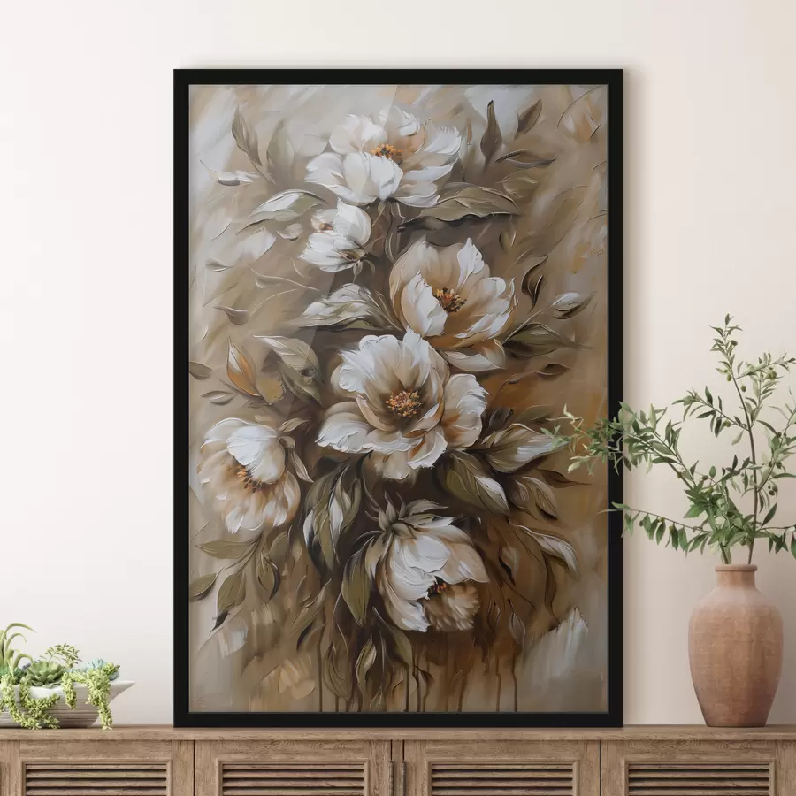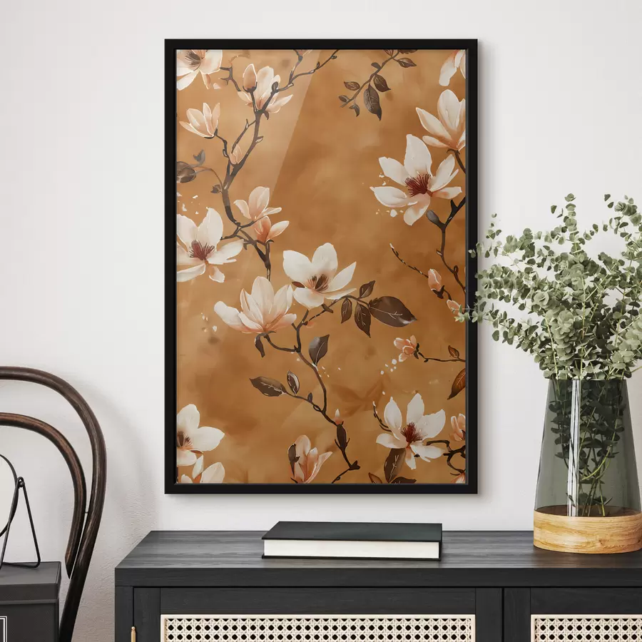 Baltos magnolijos žiedai švelniame, neryškiame smėlio ir rudų tonų fone, tapybos stilius
