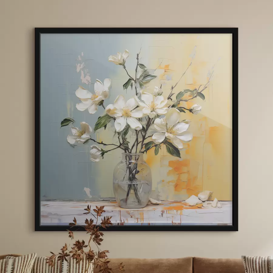 Šakelės su baltomis jazminų gėlėmis stiklinėje vazoje, tapyba aliejiniais dažais, abstraktus menas, mėlyna ir geltona spalva