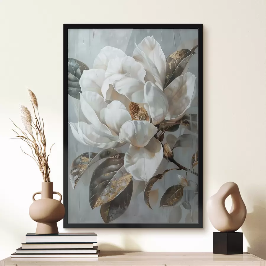 Baltos magnolijos baltoje vazoje: minimalistinis gėlių paveikslas