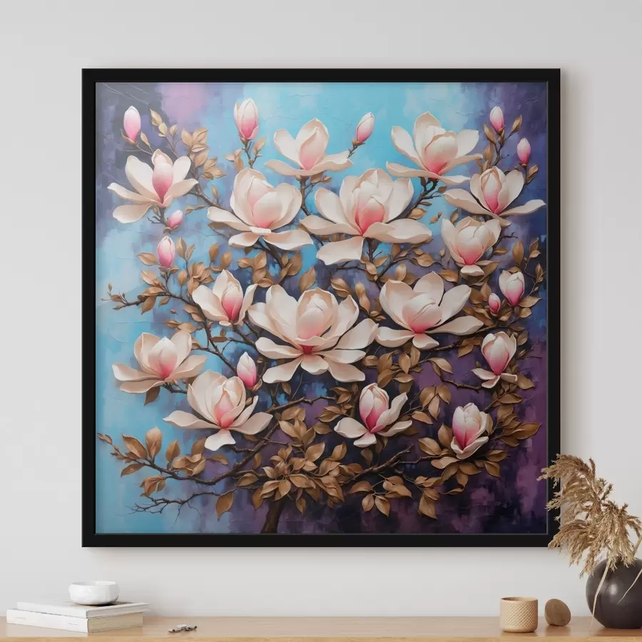 Baltos magnolijos tamsiame fone tapybiniu stiliumi
