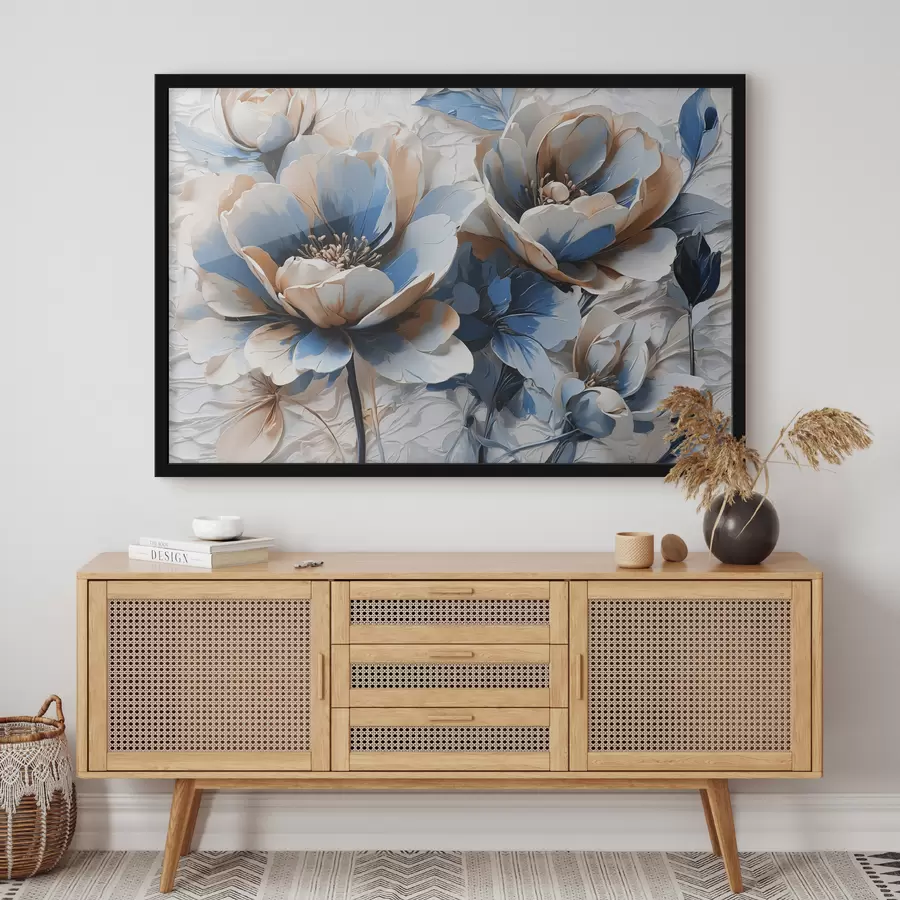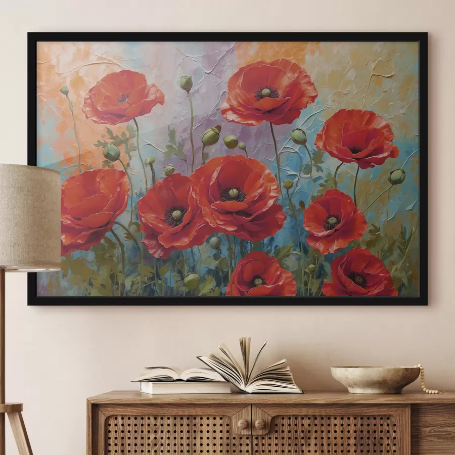 Baltųjų aguonų aliejinė tapyba, mėlynos ir oranžinės spalvos