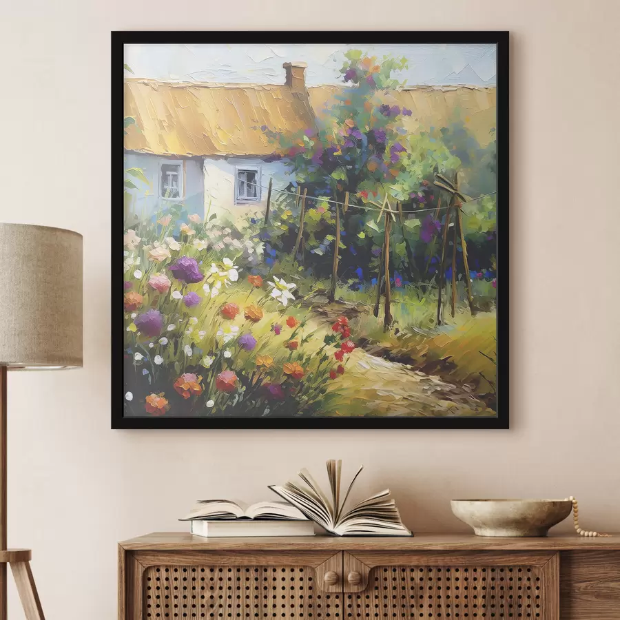 Vasara kaime, aliejiniai dažai, sodyba, medžiai ir gėlės, sodas, kaimiškas stilius
