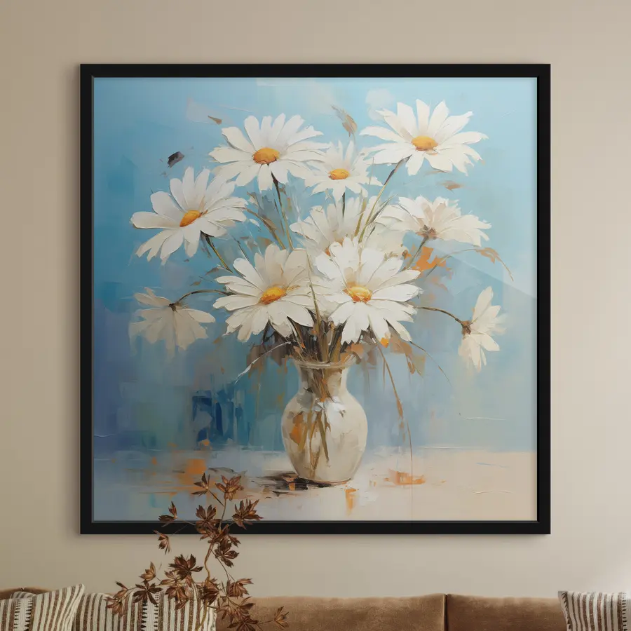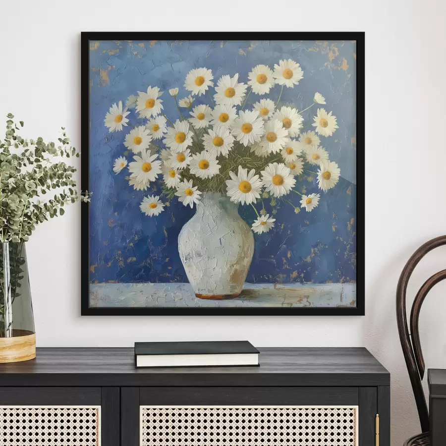 Baltos ramunėlės stiklinėje vazoje mėlyname ir geltoname fone, aliejinės tapybos imitacija, dideli potėpiai