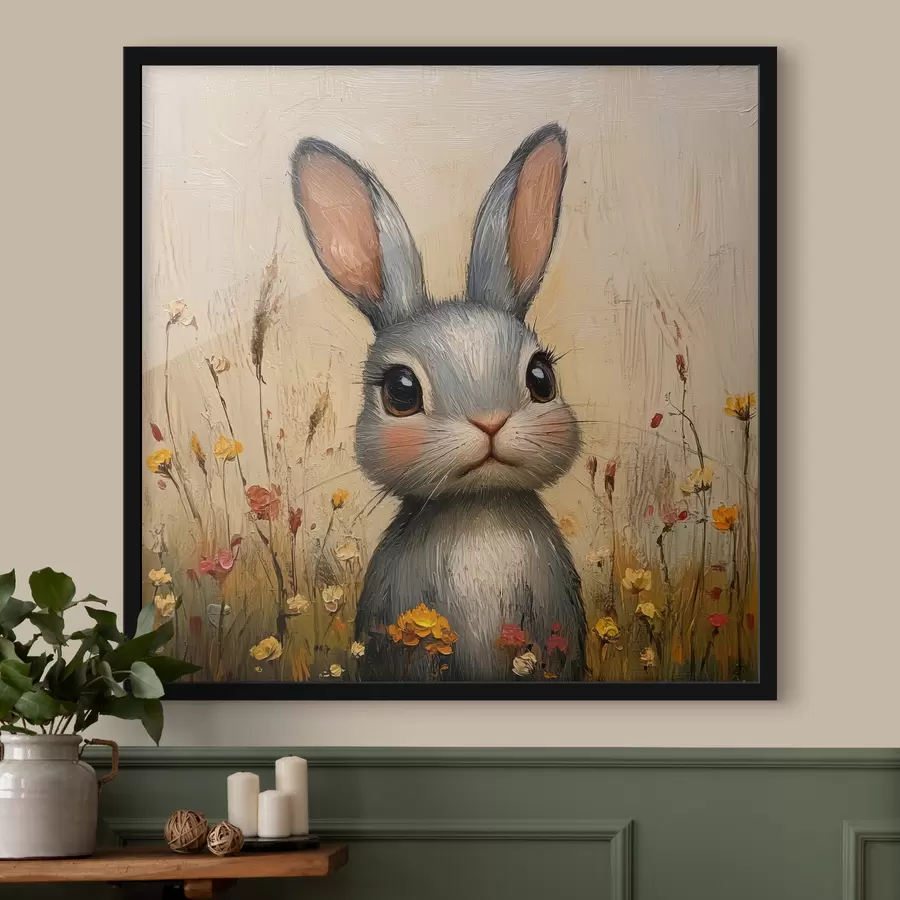 Zuikis lauke tarp gėlių su teptuko potėpiais