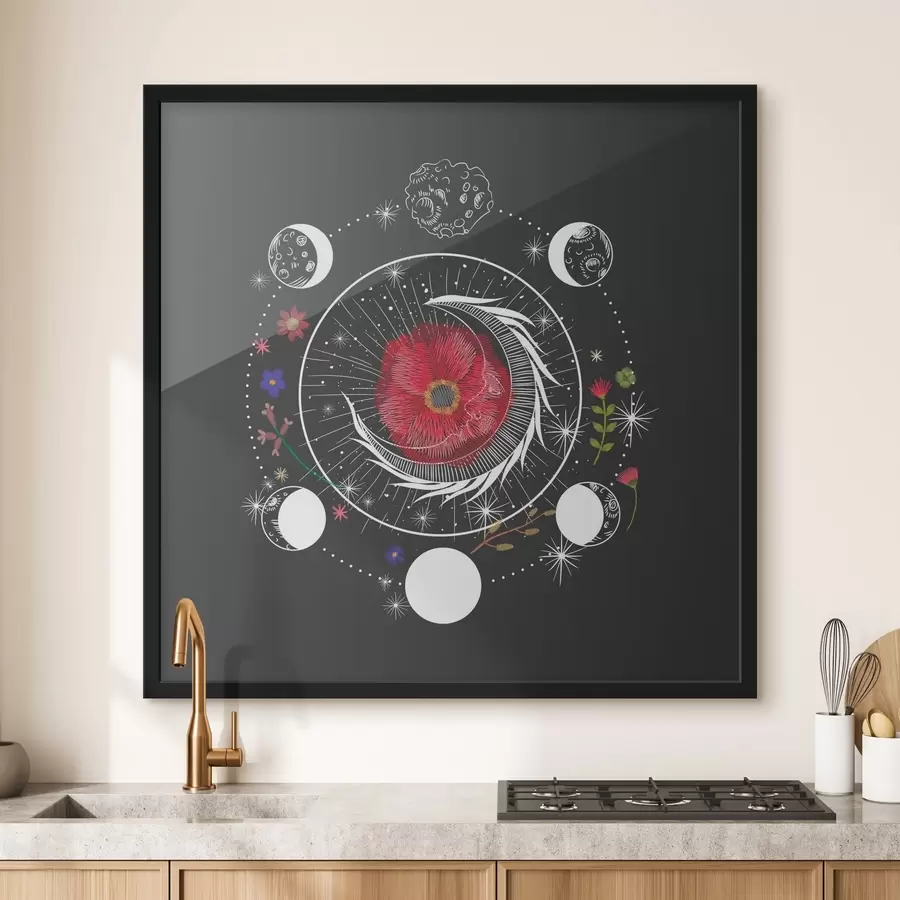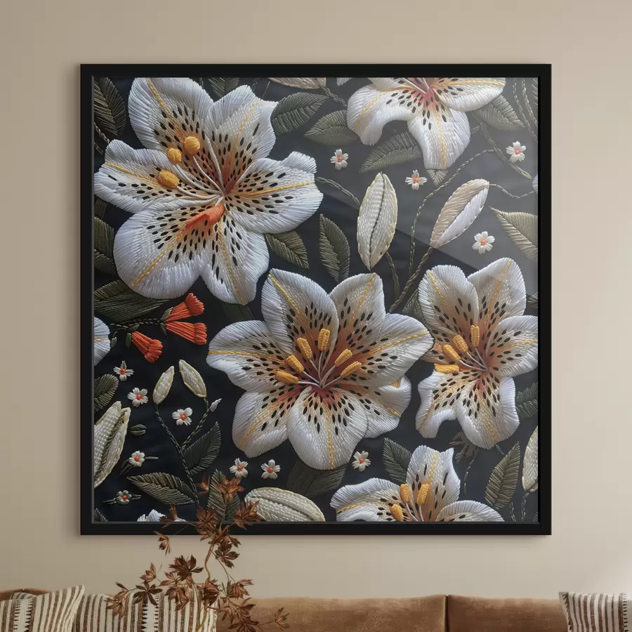 Kelmo siuvinėjimas: žydinčios lelijos juodais siūlais ant puošnaus audinio su detaliu vaizduojamuoju menu