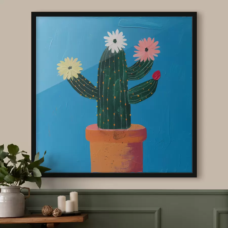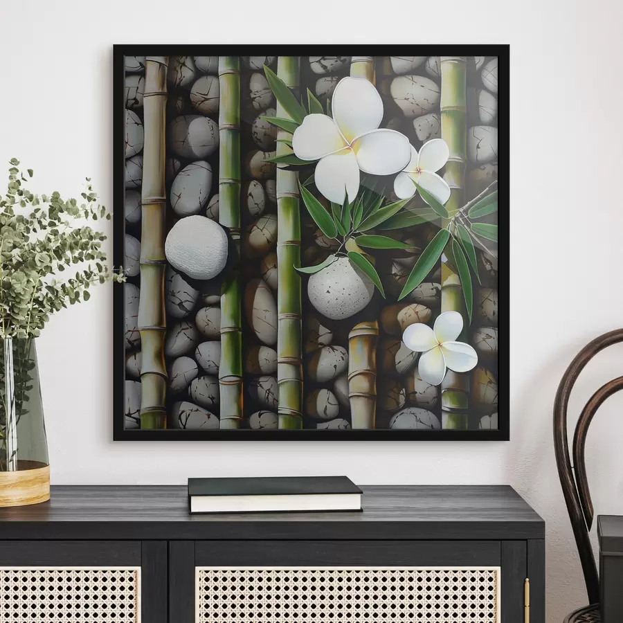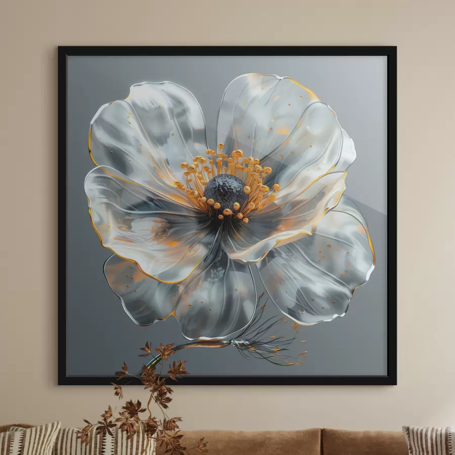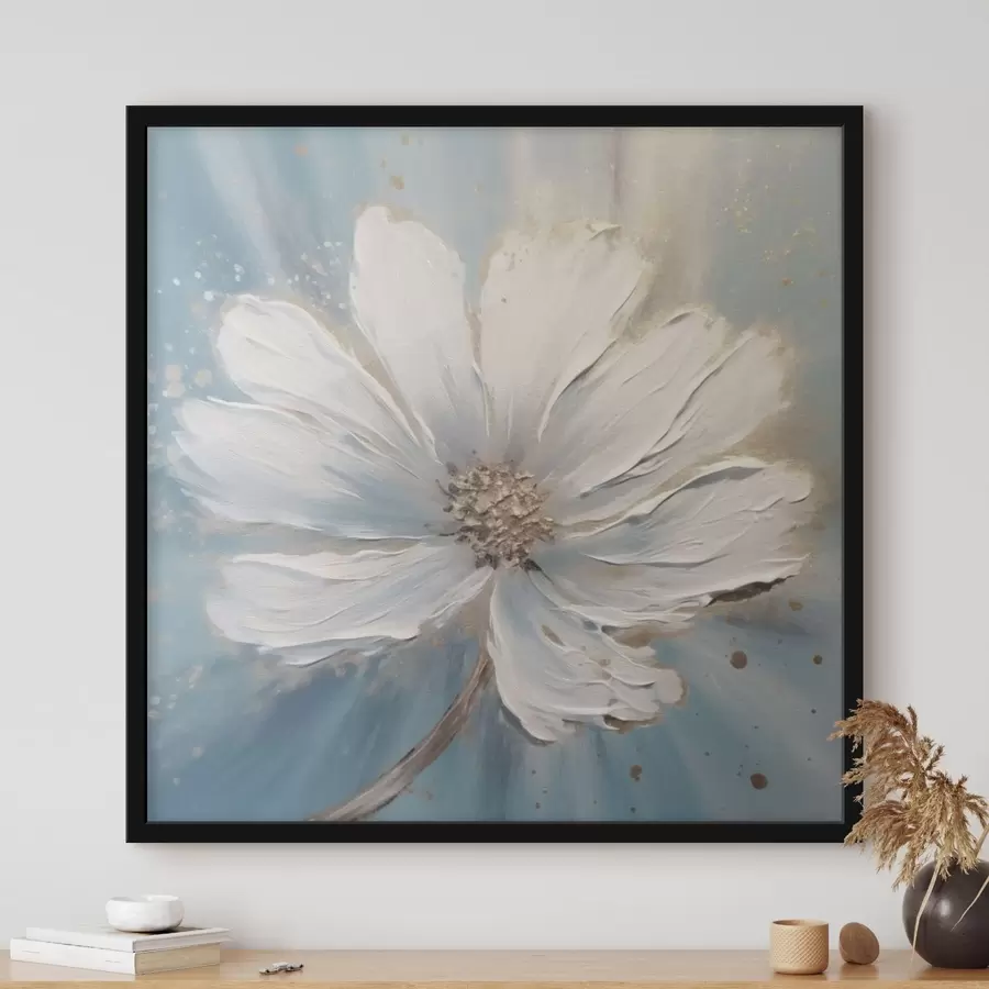Balta gėlė su lapais akrilo tapybos stiliumi