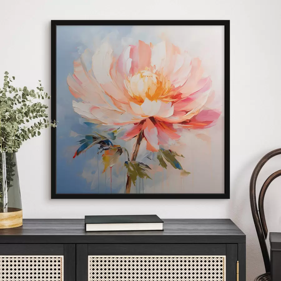 Bitė ant rožinių bijūnų, spalvingos vasaros gėlės, tapyba aliejiniais dažais, ryškūs potėpiai teptuku