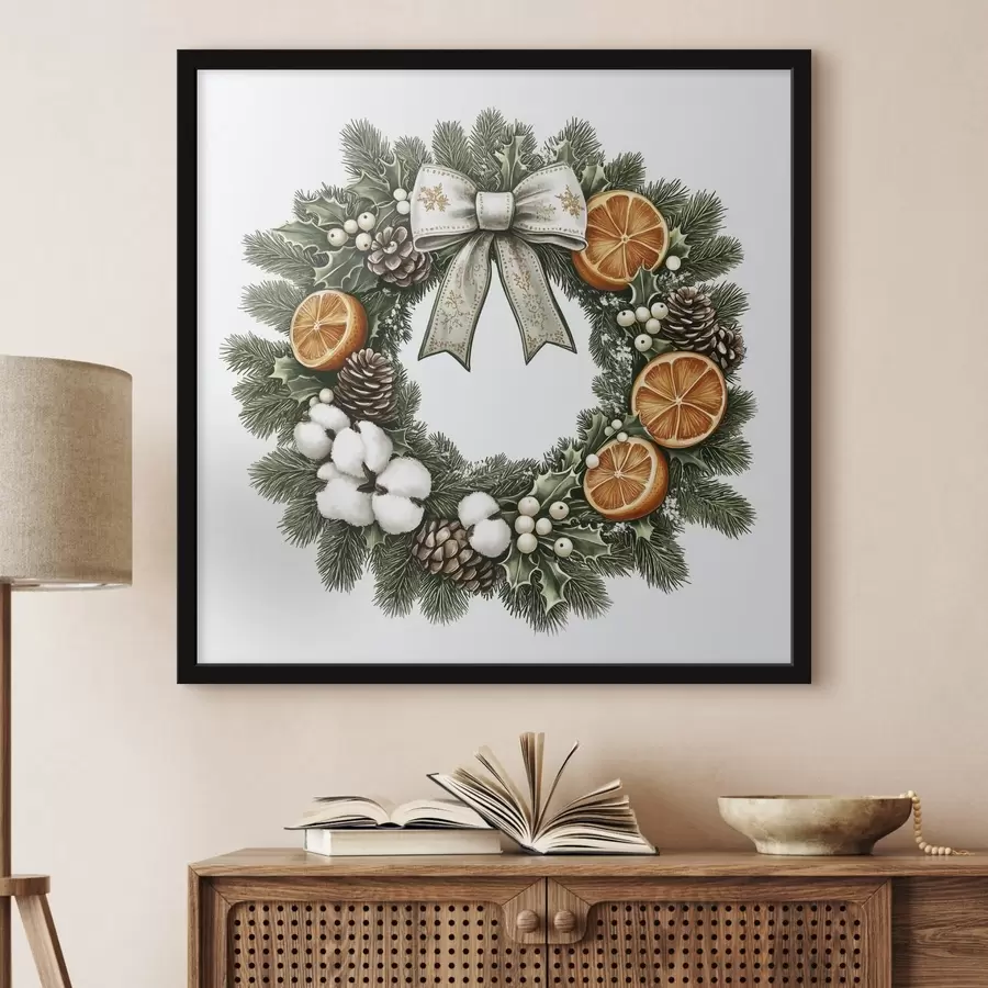 Kalėdų vainikas su medvilne, apelsinais, miško uogomis ir spurgomis, akvarelės stilius