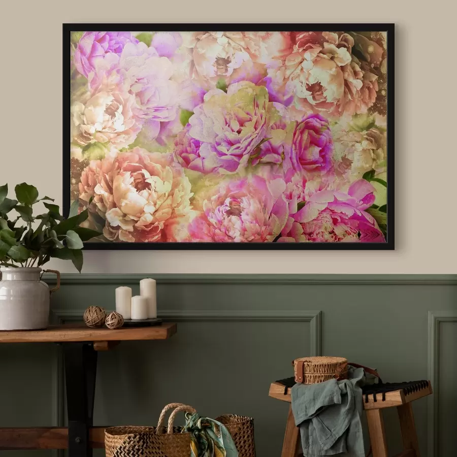 Didelių rausvų bijūnų su minkštais žiedlapiais ir geltonais centrais, apsuptų žalių lapų, imitacija aliejiniais dažais
