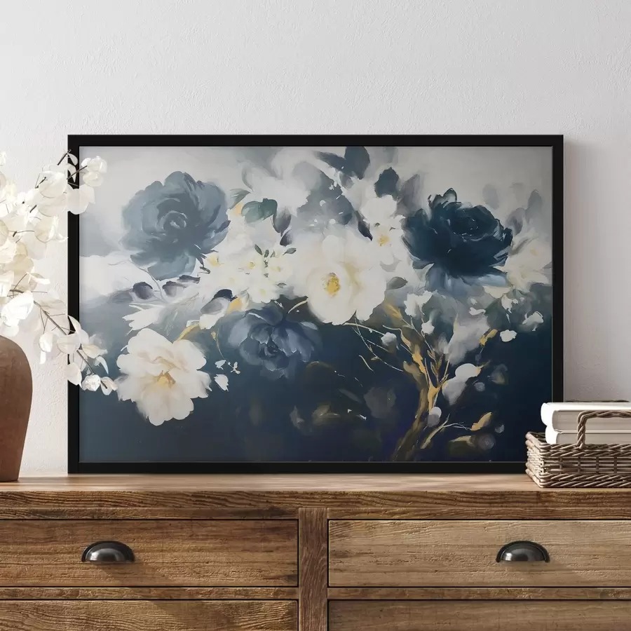 Gėlių kompozicija su pastelinių spalvų gėlėmis ir mėlynais lapais, aliejinės tapybos imitacija