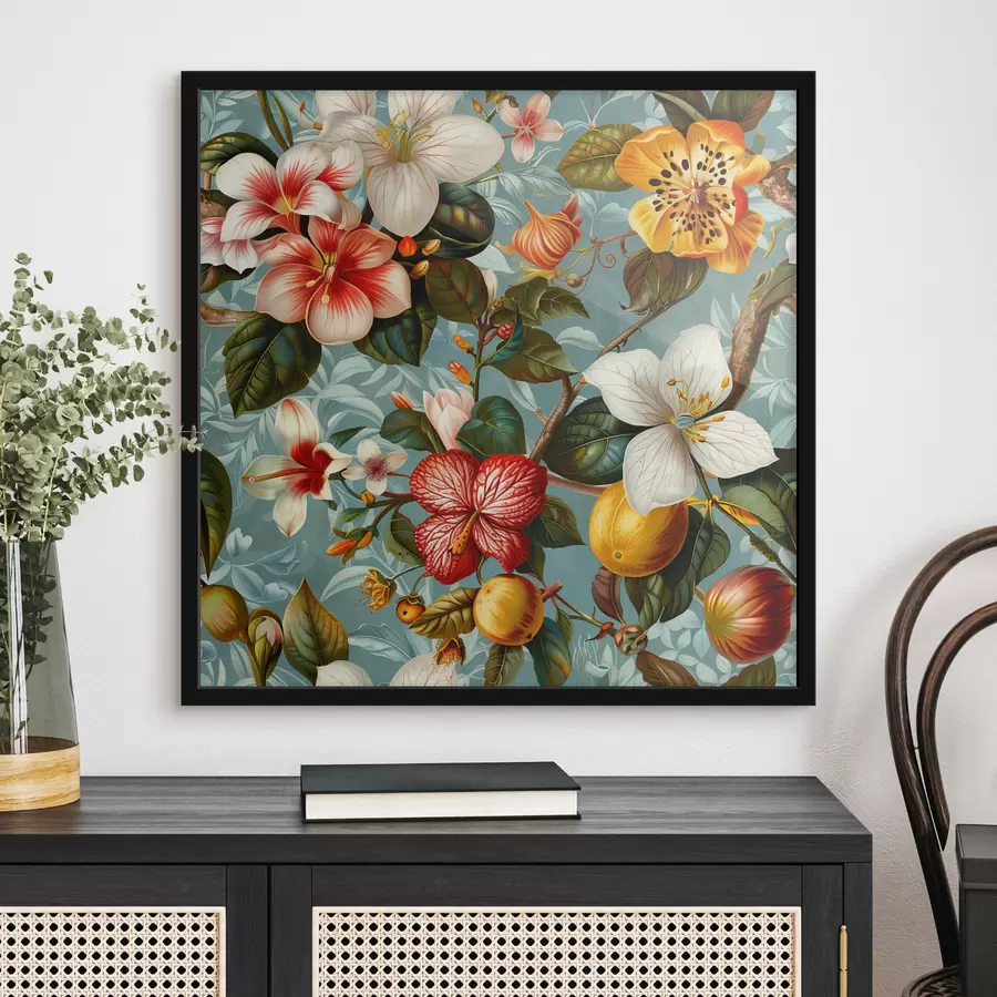 Kompozicija su įvairia žaluma ir atogrąžų gėlėmis mėlyname fone