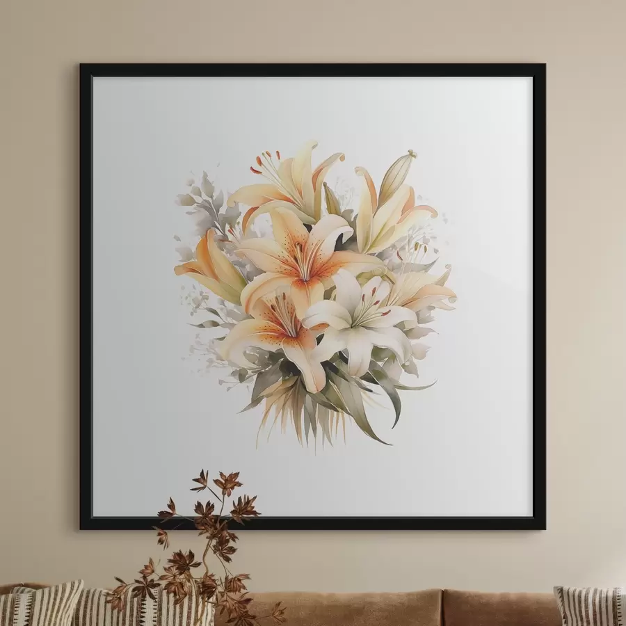 Narcizai vazoje, balti, oranžiniai, smėlio spalvos, mėlyni