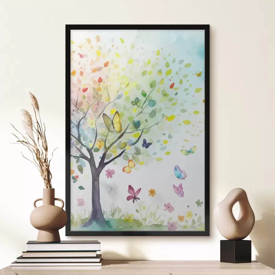 medis su ryškiais lapais, akvareliniais dažais, drugeliais