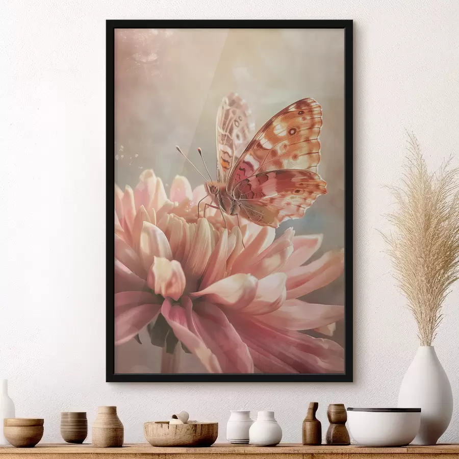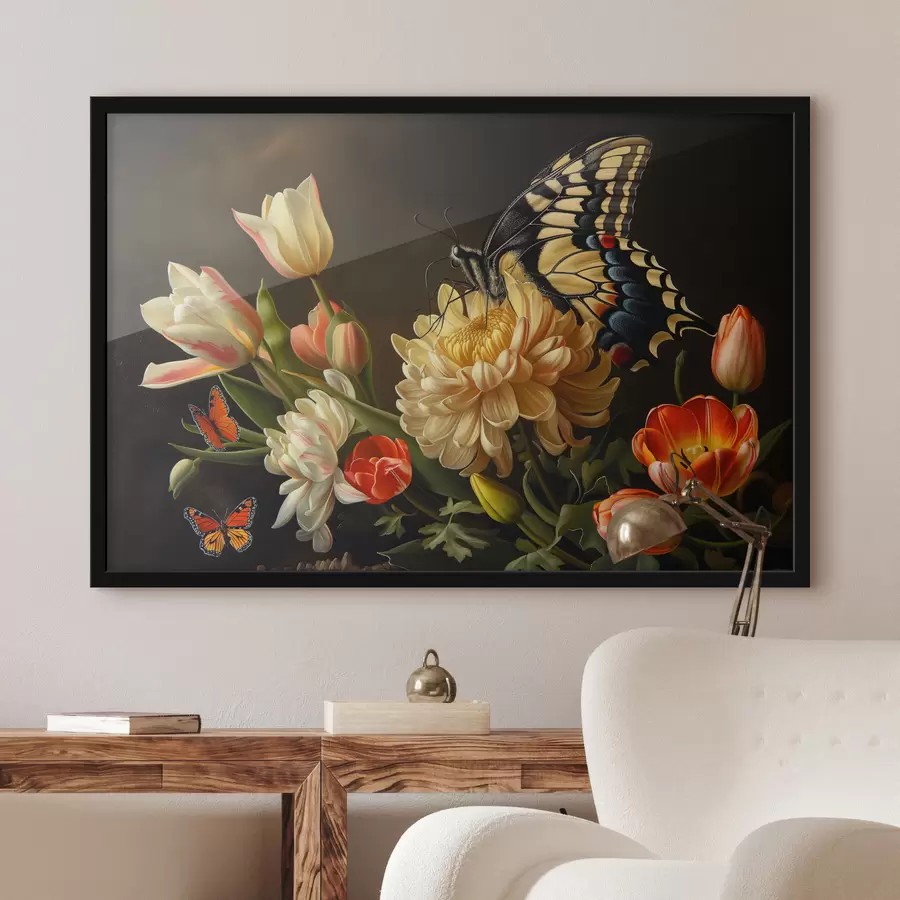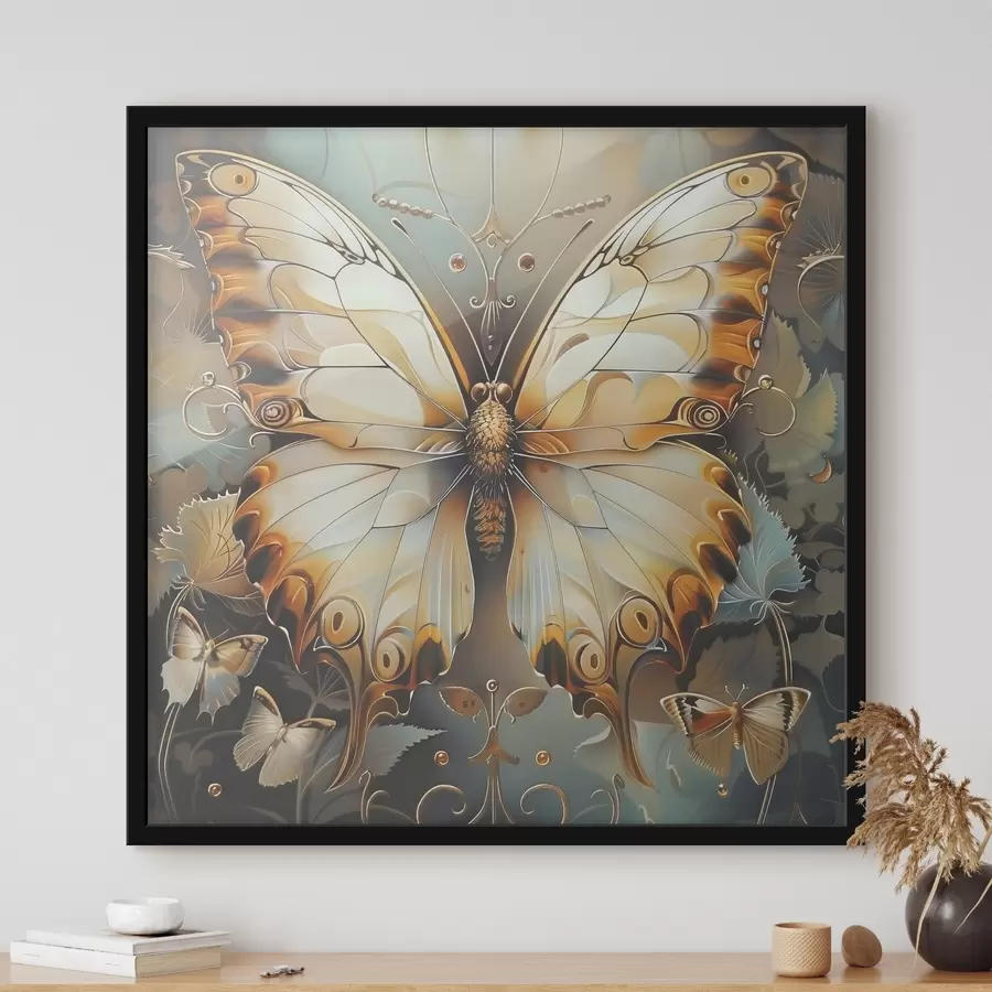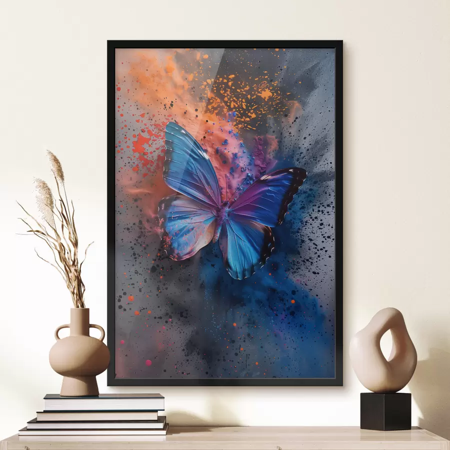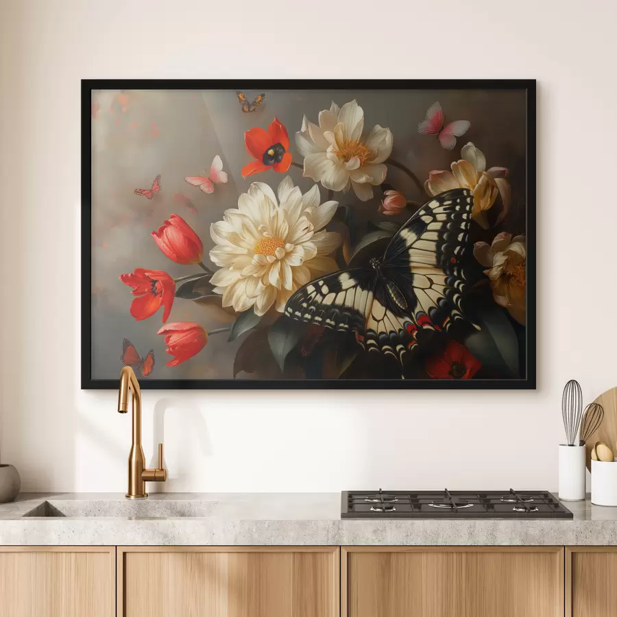 Dinamiška drugelio ir gėlių dėmių kompozicija meno stiliumi