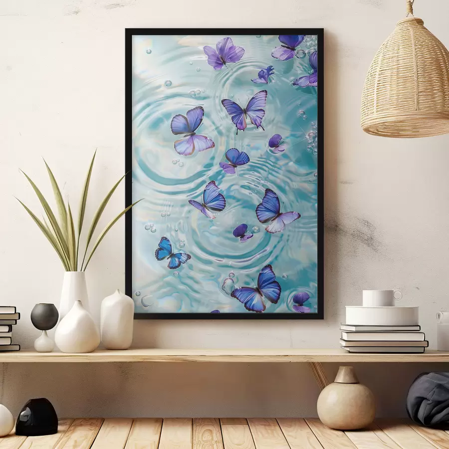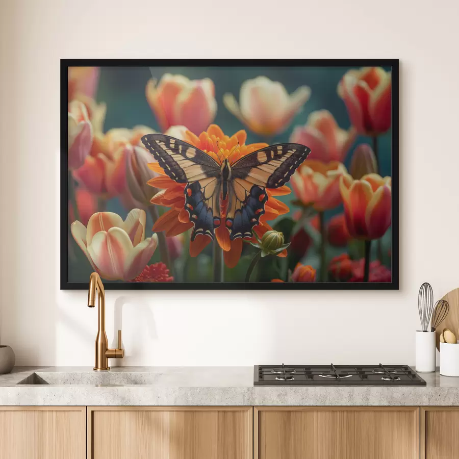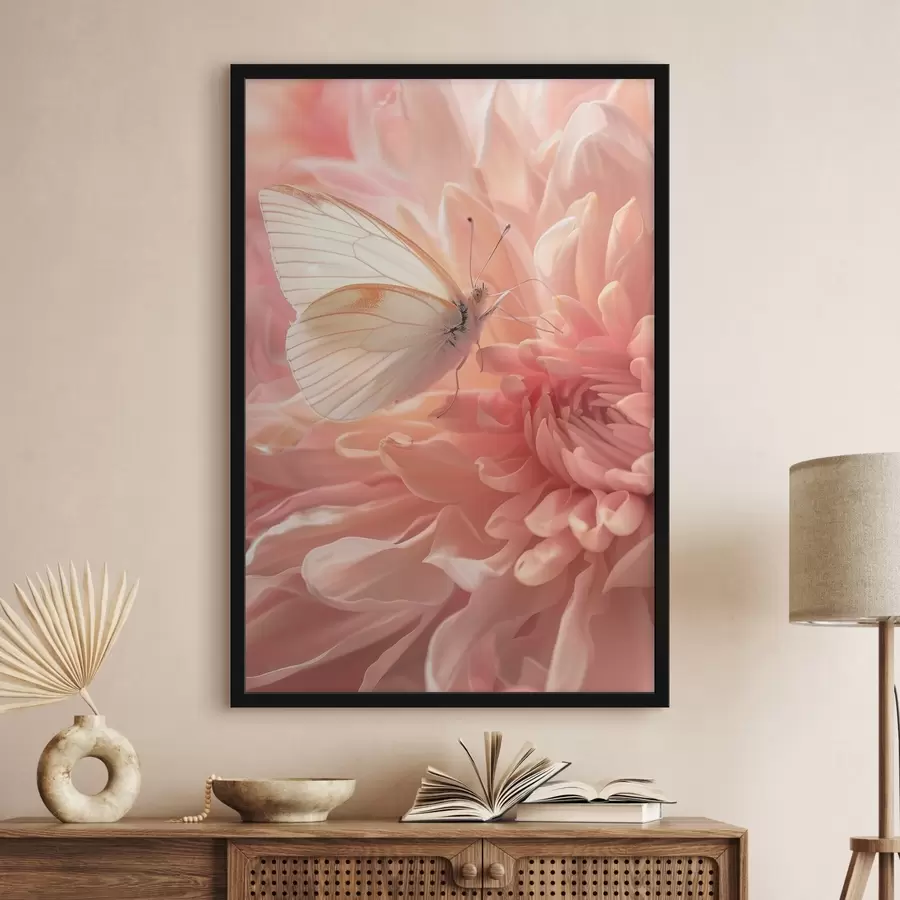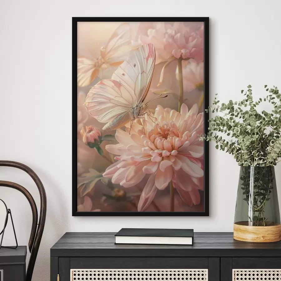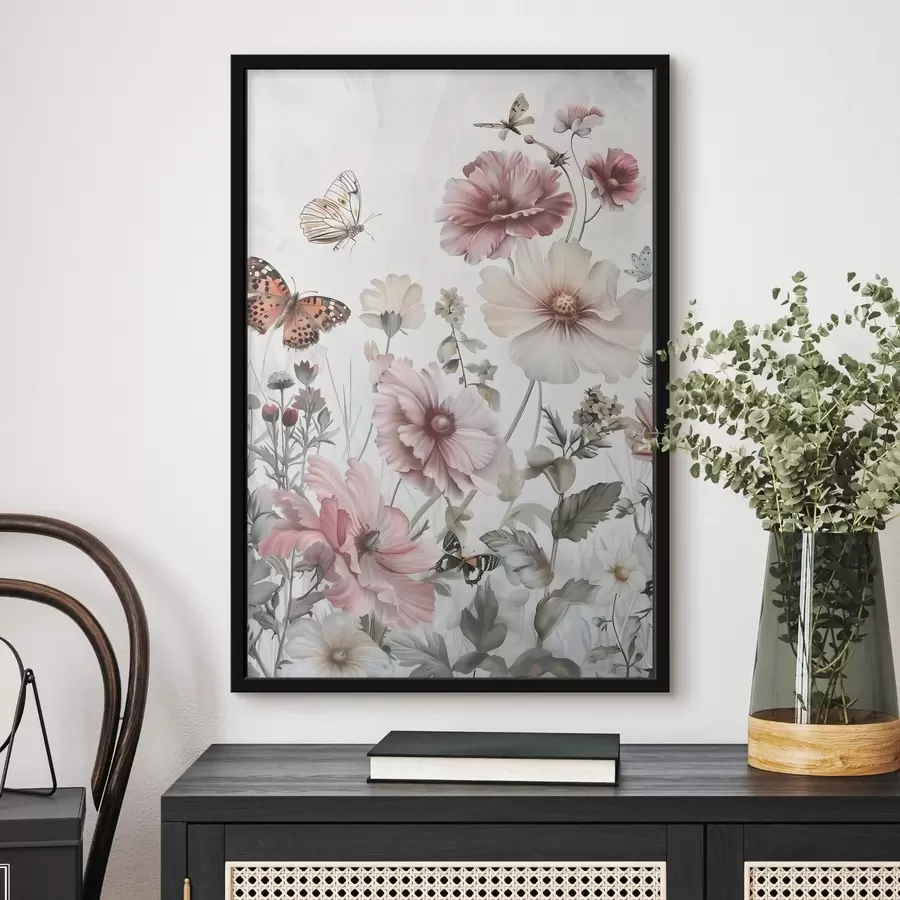 Dinamiška drugelio ir gėlių dėmių kompozicija meno stiliumi