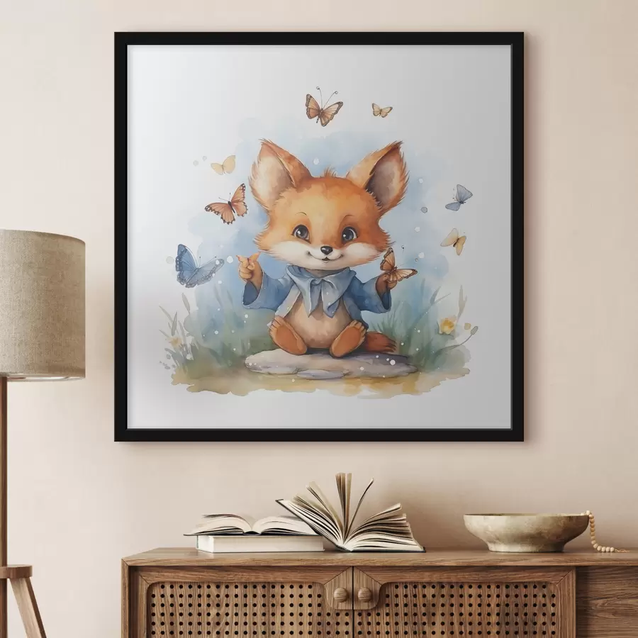Maža lapė mėlynu kostiumu sėdi ant vejos tarp skraidančių drugelių, akvarelinė iliustracija vaikams