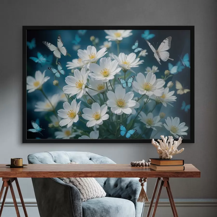 Baltų margučių žiedų laukas su tarp jų skraidančiais mėlynais drugeliais neryškiame mėlyname fone