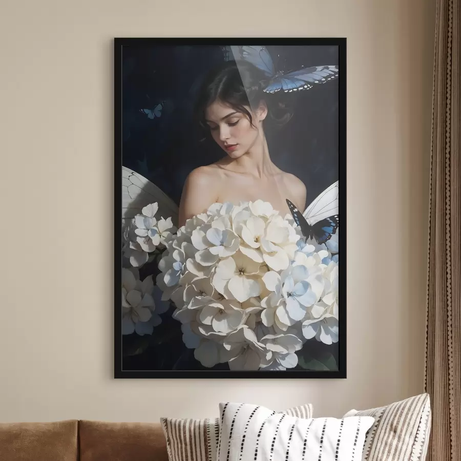 Jauna moteris, laikanti didelę baltų gėlių puokštę tamsiame fone su mėlynais drugeliais