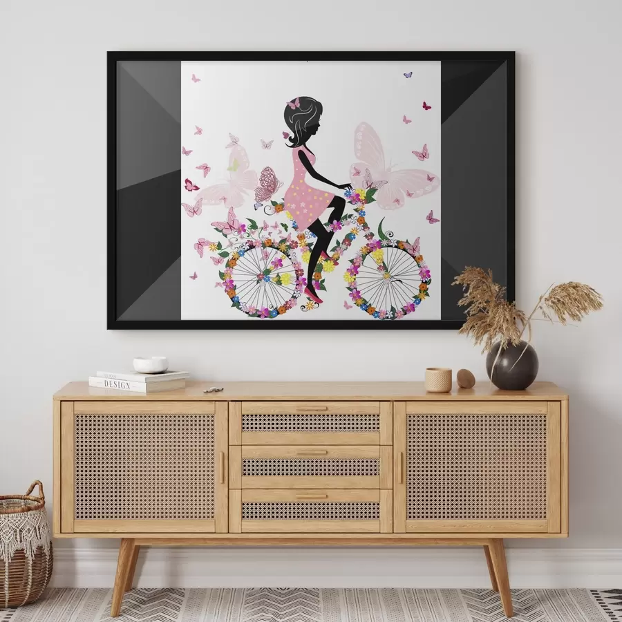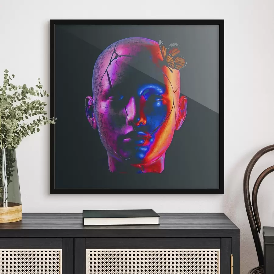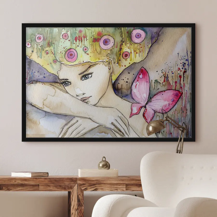 Aliejinis paveikslas, kuriame vaizduojama jauna moteris tamsiame fone apsupta spiečiaus spalvingų drugelių